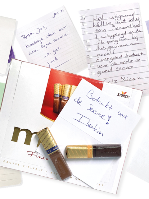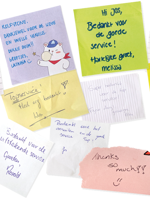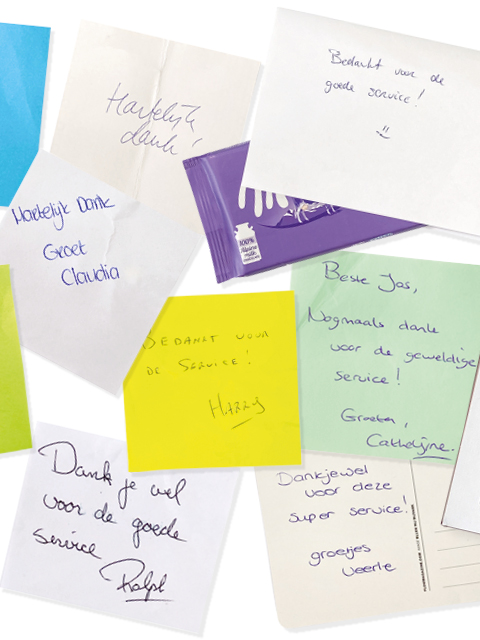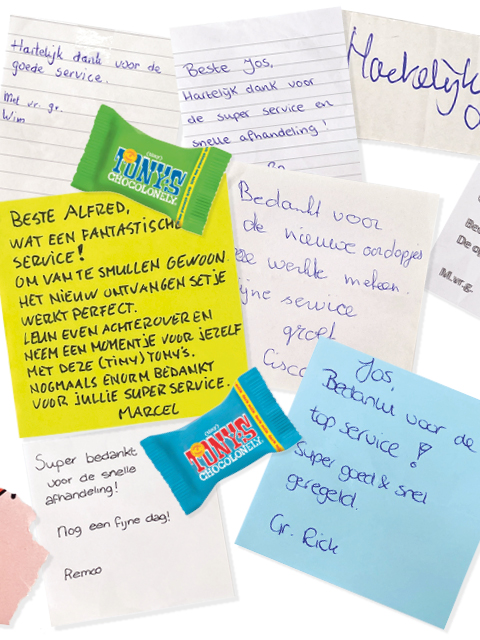 Een deel van de bedankkaartjes die we regelmatig binnenkrijgen. De achternamen van de afzenders hebben we verwijderd maar voor de rest zijn het de originele berichtjes, chocolaatjes, snoepjes, dropjes, repen en andere lekkernijen (de meeste waren echter al op voor de kaartjes naar de fotograaf gingen).