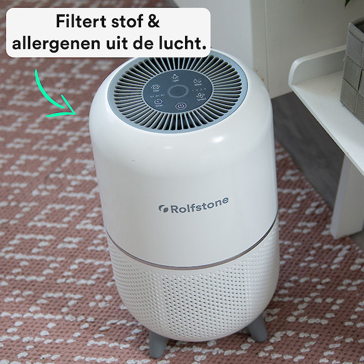 De Rolfstone Air Balance luchtreiniger biedt hier uitkomst. Speciaal ontworpen voor gebruik in de slaapkamer, filtert deze deeltjes uit de lucht zoals pollen, huisstofmijt, huidschilfers van huisdieren en meer.