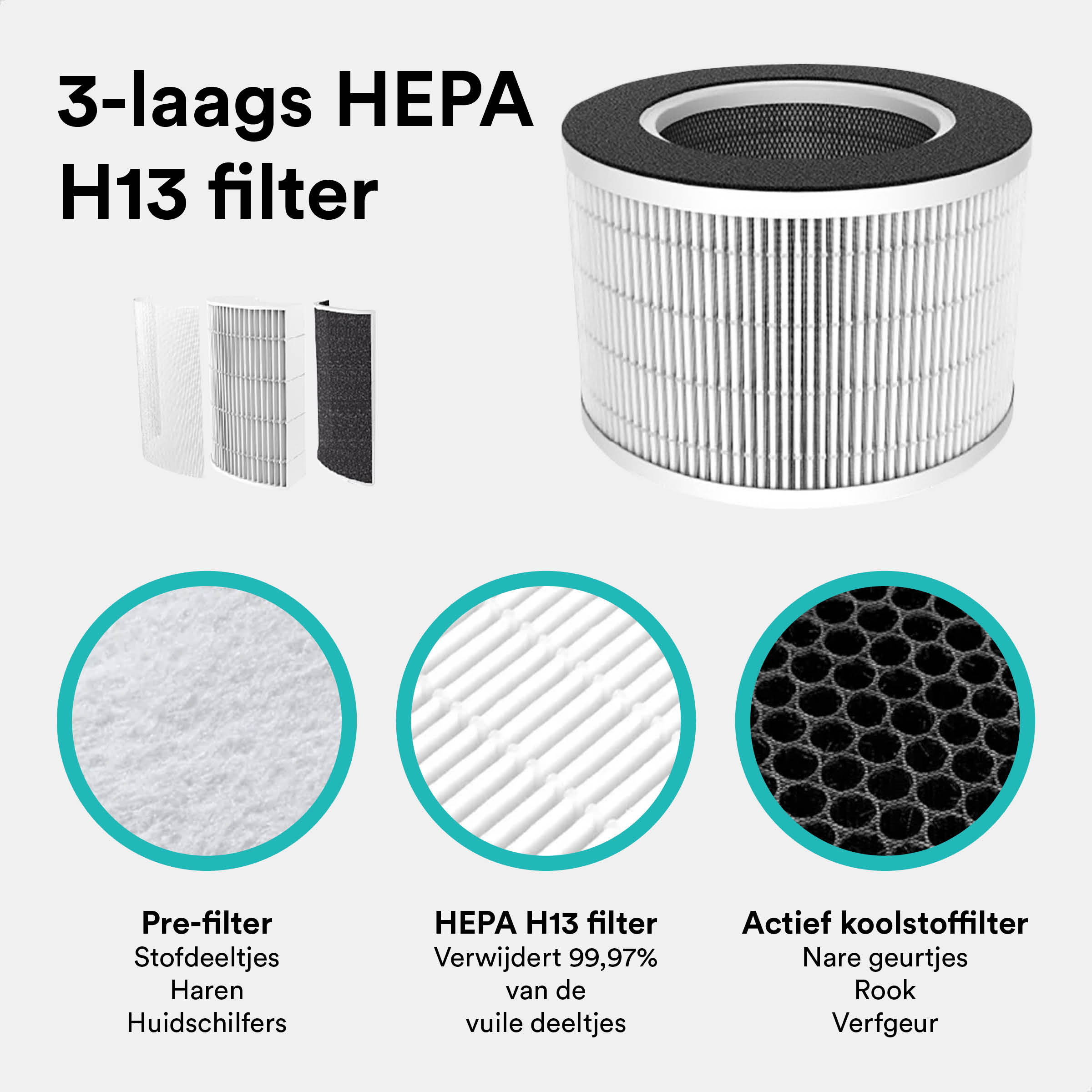 Het HEPA-filter in de Air Balance haalt 99,97% van de kleine deeltjes uit de lucht. Daarnaast bevat het ook een actief koolstoffilter dat helpt onaangename geuren in de kamer te verminderen. Zo zorgt de Air Balance tesamen met goed ventileren niet alleen voor een schonere lucht in je slaapkamer maar ook voor een frissere algehele omgeving.