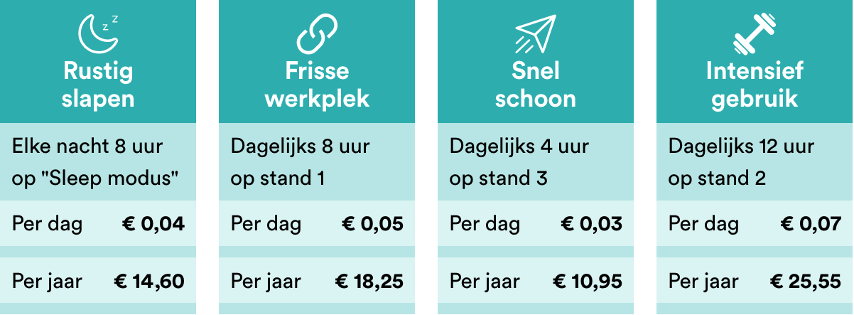 - Handige tip: zet de luchtreiniger twee uur voor het slapengaan op de hoogste stand, met de deur dicht en eventueel het raam op een kier. Zo begin je de nacht in een optimaal gereinigde ruimte.