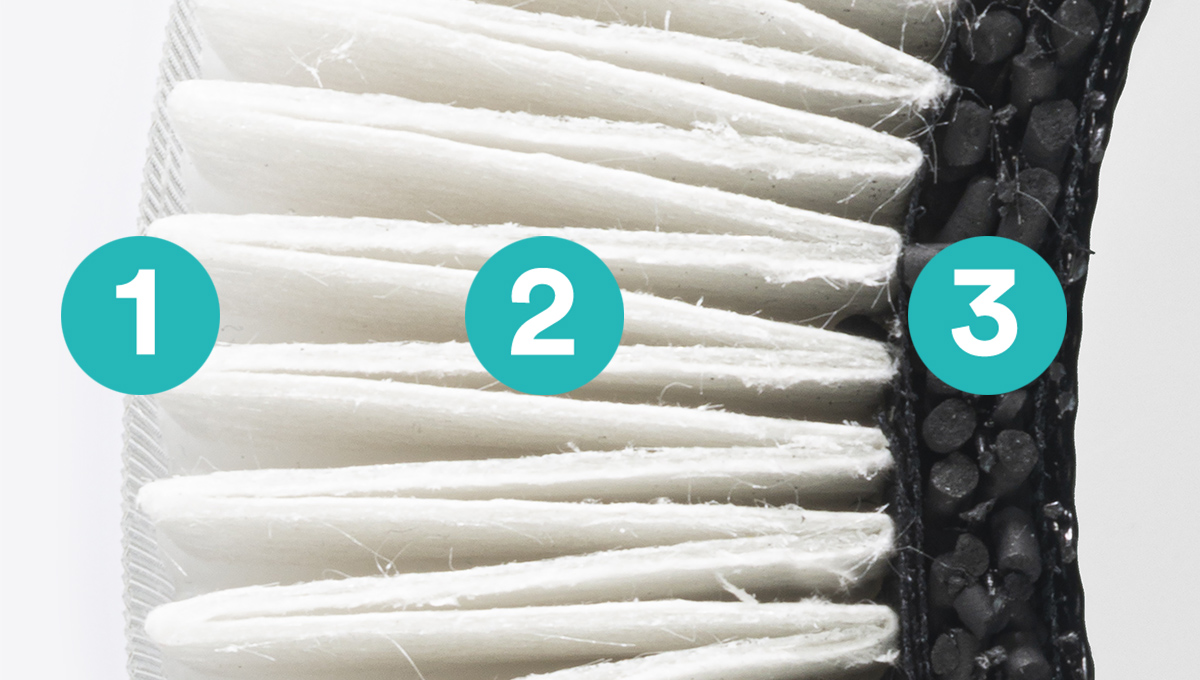 - De eerste laag zit aan de buitenkant en deze houdt al het grove vuil tegen. Denk aan grotere stofdeeltjes en haren. Dit deel zorgt er voor dat het 2e filter niet te snel verstopt raakt.